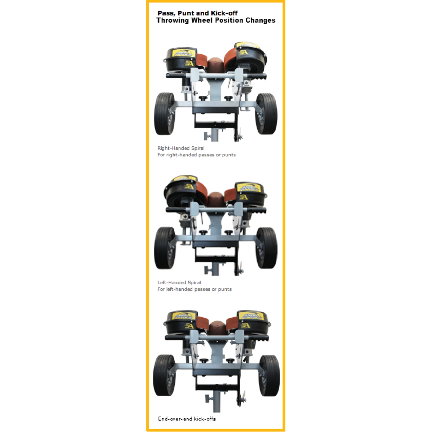 Adjustable Throwing Head: Rotate and tilt wheels for right- or left-handed passes, punts, or end-over-end throws